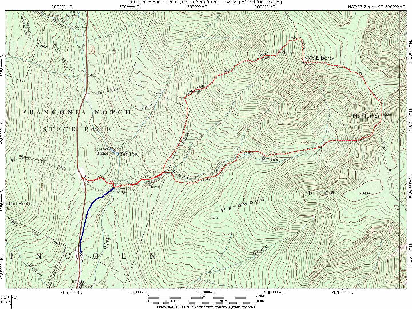 Finally, our map shows two routes, one red & one blue. The blue route shows the actual location of the trail. The description in the White Mountain Guide is correct, the Topo is out of date.