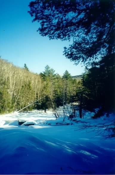 We arrived at the Lincoln Woods Visitor Information Center at about 10:30 AM. The first thing that struck us was the number of cars in the parking lot. Wow, what a crowd. Not quite as bad as summer, but bad nonetheless. The second thing that struck us was the fact that the trail is such a popular cross-country ski track that it is packed and groomed for most of its length -- at least up to the Wilderness boundary. This was not shaping up to be the off-trail snowshoeing experience that we were hoping for. But -- too late to turn back, we decided to make the best of it anyway. After securing a new Parking Permit ($20) for the year, we geared up. Each of us carried a day-pack with extra clothes, food, water, and other gear. We had decided that hot food for lunch would be important in this kind of cold, so we also brought a stove and a cooking pot. After stuffing everything into and lashing the rest onto our packs, we headed off in our boots, the beginning of the trail being so well packed that snowshoes weren't necessary. By this time the thermometer in the visitor's center showed a comfy 16° F.