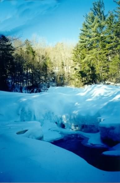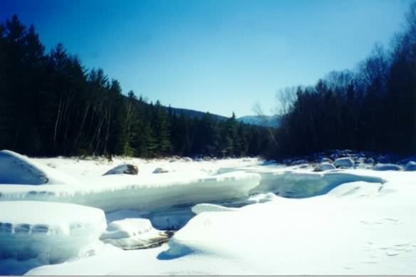 After about ½ a mile, we found ourselves putting on our snowshoes and stripping down to our fleece layers. Although not absolutely necessary, the snowshoes did make walking on this packed section of trail easier, and we kept them on for the rest of the day. We followed the trail at a medium pace alongside the river for a few miles, taking short detours here and there for good photo opportunities. Eventually we came to the turn-off for Franconia Falls and we headed the .3 miles up the trail to get there. Franconia Falls is actually a series of little pools and cascades popular with swimmers in the summer. We ate and rested for about 45 minutes and then headed back out. Once we rejoined the main trail we swapped snowshoes so that we could give you a better, more thorough review by each trying both brands (Chris has Tubbs and Rob had MSR). The hike out was totally uneventful -- flat and steady. After another 2 hours we found ourselves back in the parking lot and ready for the Yankee Smokehouse. This is a great winter dayhike due to its non-challenging terrain and proximity to incredible scenery. If you're a skier or at least willing to put up with them, we recommend this hike highly. Stay tuned for more winter hikes in the White Mountains. If you would like to contribute your winter hikes to the Hike-NH page, please click here or e-mail us at webmasters at hike-nh.com.