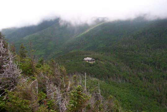 At about 3 miles, the trail bears away from the Gale River and begins a more earnest ascent to the Galehead Hut. The scenery stays pretty much the same; trees and more trees with the occasional view out over the valley. At 4.6 miles you reach the saddle where the Galehead Hut (3,800 ft.) is located and the first really beautiful views. From here much of the Pemigewasset wilderness is visible, especially in decent weather. Views of the Twins and lesser peaks are available, and the hut is an excellent place to rest, as long as you don't have a dog with you (which of course, I did).