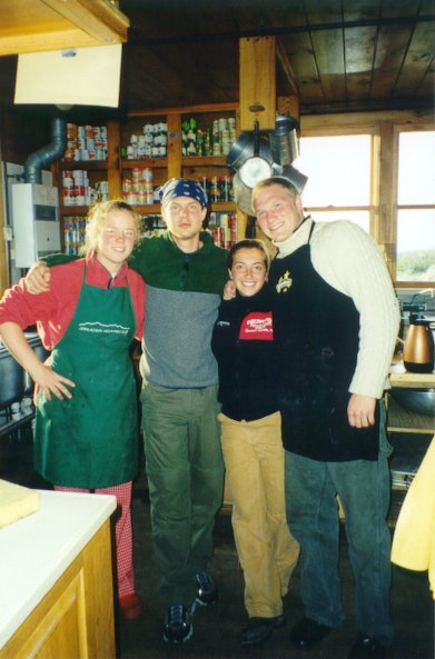 Once the group got back from the nature walk, several people packed it in and hit the bunks. We don’t like to try to sleep before 9:00, so we stayed up for a while and chatted with the hut Croo and some of the other guests. Around 10:30 we decided to hit the hay. Now, the end of that paragraph may have sounded peaceful and tranquil, but that is anything but an accurate portrayal of the scene as we entered the bunkhouse. Upon opening the door, we were assaulted with a chorus of snoring. At least three people were having an "I’m louder than you are" battle, and there were no signs of a peace agreement. We hopped in bed anyway, hoping our exhaustion from the day’s hike would take over and we would find sleep anyway. Yeah, sure. Whatever. After two hours of snorts, sniffles, grunts, and other bodily noises (we had chili, remember?) Chris was wondering if it weren’t possible to set up the tent outside, and Rob was wondering why he had left his .40 caliber Smith & Wesson at home. Trying to sleep was miserable and next to impossible. Hut veterans had probably brought earplugs and managed to get at least some sleep, but for us that was next to impossible. From 10:30 PM to 6:00 AM, we each got about 2 hours of sleep. No exaggeration. As promised, at 6:00 AM the hut was called to arms by Mr. Howser as he strummed his guitar bringing everyone slowly out of their slumber. Breakfast was at 7:00 AM sharp, so we got up and dressed. At 7:00, we were greeted with pancakes, turkey sausage, oatmeal, coffee, tea, water, and grape juice as well as the usual accoutrements. Again, the food was well prepared (if not a little bland by nature) and the Croo did an excellent job. Shortly after breakfast, people began to pack up and head out, leaving the hut fairly quiet. We soon followed suit. Overall, the hut experience was fairly good. The Croo was very accommodating, made us feel comfortable, and provided a very relaxed environment in which to rest. Obviously we could have done without the 50 dB snoring fights all night, but that would probably have been tolerable had we thought to bring earplugs. So if you take nothing else from this page, take this: BRING EARPLUGS!!!!! and your trip to an AMC hut will be more than enjoyable.