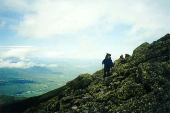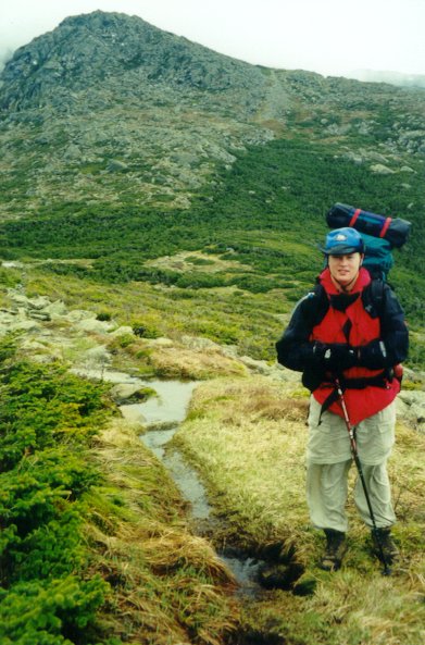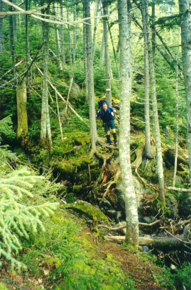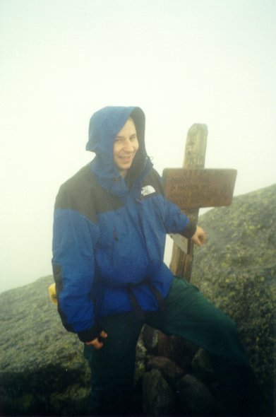 We grabbed some warm clothes, our raingear, and some water and hit the trail to the Madison summit at about 8:00. The entire way was exposed to the wind which was blowing at about 40-50 m.p.h. Visibility was really bad. We could see between 25 and 50 feet depending on the moment. Luckily, the trail from the hut to the summit was well marked and the cairns were close enough together that we could see from one to the other. However, we could hardly ever see more than one ahead. Although not as strong as the day before, the wind made the going rough. The final 50 yards of the climb was done as a crawl on hands and knees. But, we made it. Another 4000 footer bagged. The .5 miles back to the hut went quickly. Through it all, the fog seemed to soak everything it touched. But, the temperature was still remarkably warm, the one bit of luck we had throughout the trip. Many of the decisions we made would have been changed substantially if it had been cold out and hypothermia was more of a concern. Back at the hut, we grabbed the rest of our gear and started a long tiring decent down the Air Line Trail. The first mile or so is pretty exposed and the decent is pretty steep. On a clear day, the views should be great, but we can't really say one way or the other. All we saw was fog. About 1/3 of the way down, we had descended into the trees and were once again sheltered from the wind. At this point we ran into a gentleman who suggested that we divert from the Air Line trail onto the Scar Trail to avoid some particularly difficult rocky sections. Whether this was good advice or not we can't tell you because we don't know what we missed on the Air Line Trail, but we can say that the Scar Trail is no picnic. In this case, it was mostly because we traded steep rocky scrambles for moderately steep tree-root covered slopes. We can also tell you two more things: 1. Wet tree roots are really slippery. Enough said. Footing was difficult. The Scar Trail trades some of the steepness of the Air Line for a little extra distance - it connects the Air Line Trail to the Valley Way Trail and added probably .5 miles to the hike out. For future reference, the Scar Trail is very mossy, boggy, and wet. Keep this in mind. Once again, the trail doesn't appear to offer great views, but even after we had gotten out of the fog it was still overcast and cloudy and we couldn't see anything even if it did.