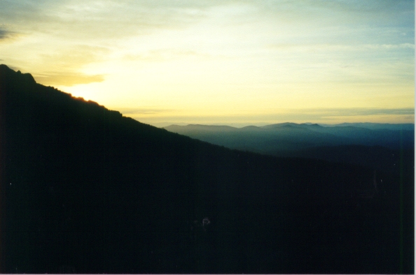 1. Although still exposed to the wind, the Pine Link Trail ran on the side of the mountain so we would be better able to brace ourselves against the wind. 2. It was a shorter, more direct route to the Madison Spring Hut, with about 400' less climbing and .4 miles less distance to walk. 3. About ½ way across the open traverse, the Watson Path provided a difficult but possible escape-route straight down the ravine into the trees if conditions became unbearable. So we pushed on and turned onto the Pine Link Trail. The walk across the side of Madison was difficult to say the least. The trail is a scramble over boulders and rock and the wind was blowing harder than either of us can ever remember. With large packs on our backs, it was all we could do to remain upright. There were times when we had to lean 45 degrees into the wind just to stay in one place. The trail became a fight to stumble from cairn to cairn where you could hunker down and get a few seconds of rest. The whole time, the cloud ceiling stayed in place just above us so visibility wasn't really a problem at our level. We fought our way through the wind and reached the junction of the Watson Path - our escape route. We decided that we could still make the hut, knowing that the trail would begin turning to the south and the wind would get lighter as we approached the ravine. After an hour or so of walking, we finally turned the corner and saw the roof of the Madison Spring Hut. We stumbled into the hut wet and tired and crumbled into a heap for 30 minutes at about 3:30 that afternoon. Then an amazing thing happened. By evening, the sky had cleared and the winds had died considerably. Go figure.