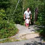 The summit is very open with both rocky ledge and scrub with plenty of area for the kids to run around. There is also the remains of a stone hut here, which I found littered with the garbage from a Boys and Girls Clubs of America group that had just left. I spent 20 minutes gathering their trash (they were nice enough to leave an empty bag as well) and then had a lot of fun running around with my daughter. We took in the awesome views for about 45 minutes, then decided to head back down. Since we had already hiked the Mt. Major (Main) trail, we all thought it would be fun to take the Boulder Loop trail back down. Heading off the summit to the South, the Boulder Loop trail was fairly easy to find by looking for the orange (or "salmon" as I was corrected to say) blazes. The grade down was very moderate for the first 300 yards and passed through an area just off the summit that was 80% scrub and trees and 20% ledge. This made a good potty break for small bladders. After this, the trail gets steep. We continued down the steep section of the Boulder Loop trail, occasionally slipping and stumbling. Footing was difficult and before long our little group was stretched out. At about 1/2 mile from the summit, there is a small boulder field (imagine that, aren't we on the Boulder Loop trail?) that has a small "lemon squeezer" and some fun little nooks for the kids to play in. After five minutes, we moved on. The trail gradually levels and footing improves significantly. Little legs moved much easier, and despite the longer length of this route, we made fairly good time. An hour and ten minutes after we left the summit, we were back at the cars. Total hike length: 3.9 milesTotal Elevation: 1150 feet Breakdowns by three-year-olds: about 4 Out of two, the number of three-year-olds awake at the end: 1