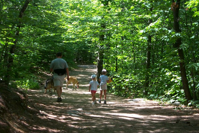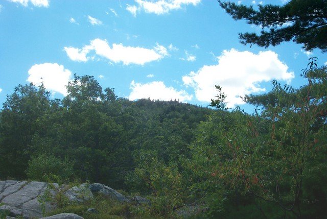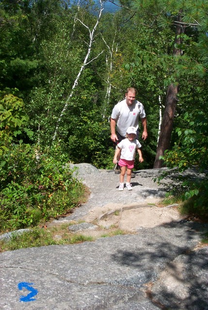 The first thing you notice from the parking lot is that there are actually two trailheads; one to the right, one to the left. Unfortunately, neither trail is well marked, so we were unsure of which trail we were taking. A quick check of each trail yielded a small sign on each that told us which trail was which: the trail to the left (South) was the Boulder Loop trail, and to the right (North) was the Mt. Major Trail. We chose the Mt. Major trail and got moving. The trail begins with a very reasonable climb and moderate footing. Despite the fact that this trail is wide enough to drive a truck up(it's an old lumber road) heavy traffic on this trip has taken its toll on the route which had the little ones stumbling a bit. Rocks of all shapes and sizes dotted the trail which was fun for my little girl, but kept progress fairly slow. The occasional boulder on the side of the trail gave the kids regular diversions that also kept our pace down, which was ok for the couple adults that haven’t been, well let’s call it “active”.