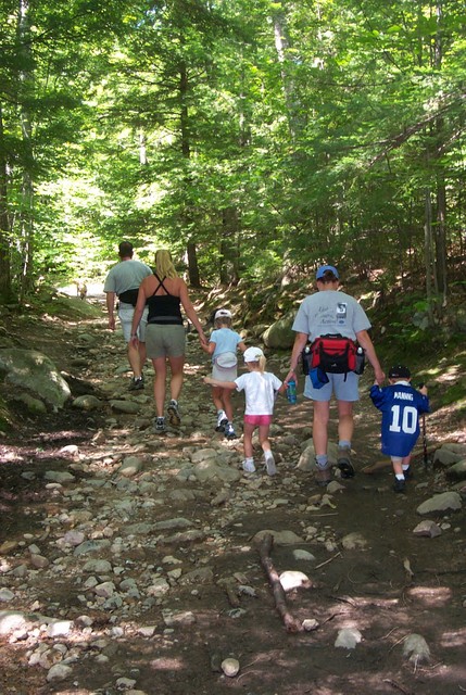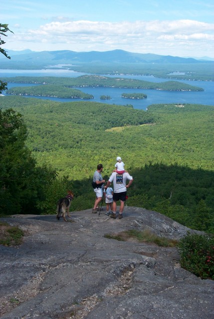 As usual, it had been far too long since I had a chance to go hiking, and with family visiting from NY I didn't think I would have a chance to make it happen, but their credit, the fam was up to it! With three kids in tow and none of them over 6 years old, I thought we should make our trip something that wasn't too strenuous, but that still had some value (translated: good views!) and Mt. Major fit the bill perfectly. Checking in the Southern NH Trail Guide, I found everything I needed to make sure this one didn't end up with the seven of us lost. I was disappointed to see that the guide didn't have a map of the Mt. Major hike, considering how popular it is. But my TopoUSA software came in very handy and we had what we need to make the trip. Since everyone on the hike was on vacation, we got going late in the morning. A quick stop at Subway gave us the provisions we needed, and we reached the trailhead right around lunch time. After a few minutes of gathering the dogs, kids, packs, poles and assorted other stuff, we heasded for the trail.