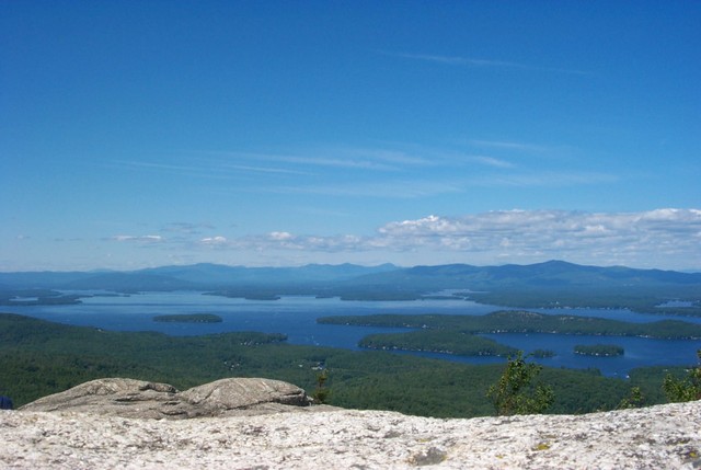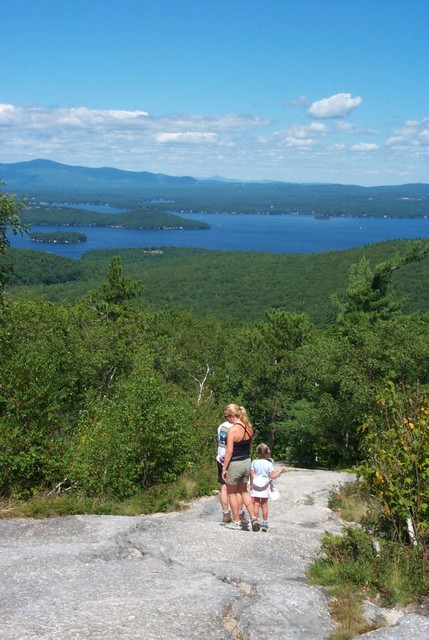 The trail continues on much the same way until about ¾ of a mile, when it turns left and steepens slightly. Footing doesn’t improve here, it stays pretty much the same and the kids struggled a little here. (It was at this point that my daughter began to ask to be carried). However things level out again for about ¼ mile before ascending once again to a beautiful outlook where we were rewarded with our first decent views. Mt. Winnepesaukee was visible from this vantage and several groups were tempted enough by these views to stop and eat there. We continued on towards the summit. Another 100 yeards up the trail we arrived you get to the mountain's ledges which are fairly steep for little kids or old folks like my sister. :) The good news is that there is an alternate route around the steepest section which we took advantage of "for the sake of the kids". No really, it was the kids we were worried about. No, I'm serious! It was the kids! Before long, all of our views were excellent and we could see for about 4000 miles in any direction. The kids were having a ball climbing up the granite ledge like real rock climbers, and I think the adults were too. After almost two hours we reached the rocky summit.