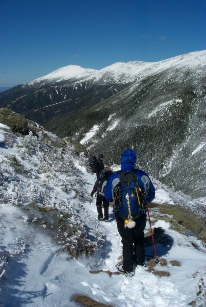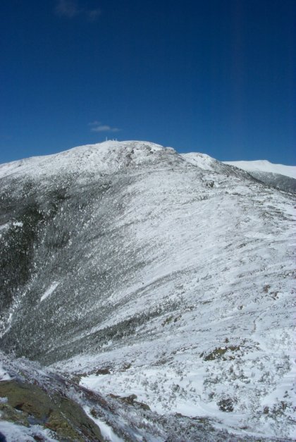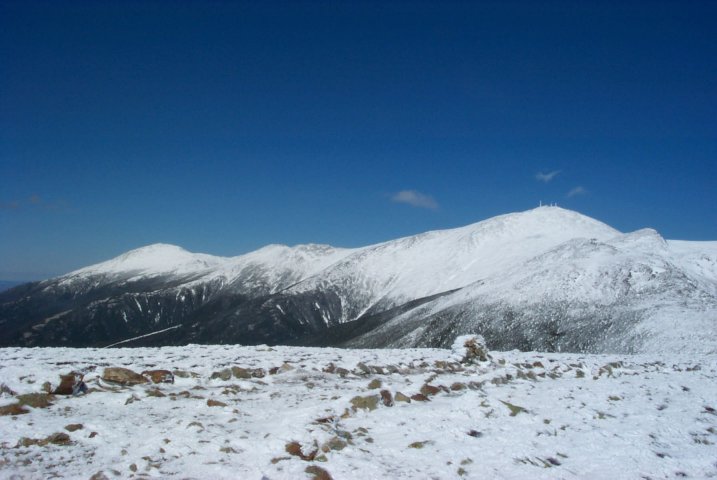 . . . More Pierce & Eisenhower Pictures . . . Click on a picture to see the large version Standing on top of the cairn on Eisenhower. And I managed not to fall off! There's a nice little foot bridge at the beginning of the Crawford Path. Descending the side of Eisenhower towards the Edmands Path. A nice view of Mt. Washington from Eisenhower. This is one seriously cold hiker we saw as we headed up the Crawford Path. He must have been wearing cotton! The Abenaki Brook near the flats on the Edmands Path. One of the great views towards Washington, Clay, Jefferson, etc. This is just me trying to be a little artsy. Ok, so I'm not so good at it, but the snow looks cool! This is the crew as we stood before the hike began! Magic, Jen and Brian on the cairn at the summit of Eisenhower. The view from Eisenhower. This is the view from the ridge between Pierce and Eisenhower. Look carefully, you can see the Mt. Washington Hotel. Click to go Back to the Trip Report