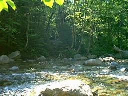 I pulled into the Lincoln Woods parking area around 7:30 in the morning. I didn't waste any time. I threw on my backpack and got truckin'. I was well prepared for the day. I was carrying 2.5 liters of water and 1 liter of OJ, a couple power bars, an apple & orange, a bag of dried figs and dates, and peanut butter & crackers. I also packed one other indispensable item that made all the difference: a towel. I read about the river crossings and figured I'd be doing some wading. I knew I didn't want to pull dry stockings back on over wet feet.