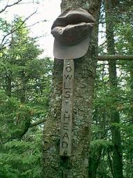 The 9 mile hike out to the base of Owl's Head is relatively level, and I arrived feeling fresh and ready for the climb. There are no written signs telling you that you've arrived; but a conspicuous, decent sized cairn on the right side of the trail clearly marks the beginning to the Owl's Head Slide Path. It's 1 mile from here to the summit. I literally couldn't see the forest for the trees all day. Not so on the slide path. I had clear, wide open views of nearly the entire east side of Franconia Ridge. The sun was beating down hard on this exposed area, so I chugged a lot of water while I slowly & cautiously made my way over the loose rocks. Eventually, the rocky slide path gives way to a wooded one that leads the rest of the way to the summit. The AMC Guide says this trail is unmaintained, but obviously folks have been doing recent work on it. With the exception of a few easily negotiable blowdowns, this trail was in fine shape. I saw my first fellow hikers of the day about 15 minutes from the summit. It appeared to be a father with his 2 teenage boys. They were coming from the summit back towards the slide. The father looked like he was having a good time. The boys were bitchin' about the rocky descent that awaited them. We all chatted for a few moments, then I pushed on. I've read that hikers routinely swipe Owl's Head signs as souvenirs. I was hoping that I'd find at least one sign marking the summit for my photo album.