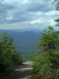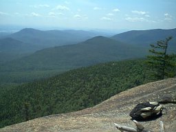 A little further on, past the dramatic south ledges, I picked up the Rollins Trail. Rollins took me over the true, unmarked summit of Whiteface and on to Passaconaway. This wooded ridge trail is pleasant and gave me occasional glimpses of peaks to the northeast, including Passaconaway itself. After a couple miles the Rollins Trail intersects with Dicey's Mill Trail. I took a left onto Dicey's Mill and pushed ahead 1 more mile to bag my 4th 4000er of the weekend. This last part of the hike took me over a few wet and muddy sections of trail, but nothing major. The very summit of Passaconaway, however, is a let-down. Near the top I came to a summit sign pointing right. Forty yards down this path and there I was….a tiny little clearing. That's it. Not even a cairn! Oh well. Actually, the best thing about Passaconaway is an east outlook roughly 250 yards beyond the true summit. This narrow ledge offers excellent views right up to the Rock Pile. The bugs were bad here too, so I snapped a few pictures, chugged the last of my water and orange juice, and started the 4.5-mile descent back to the Ferncroft parking lot. All in all, a great hiking weekend. |