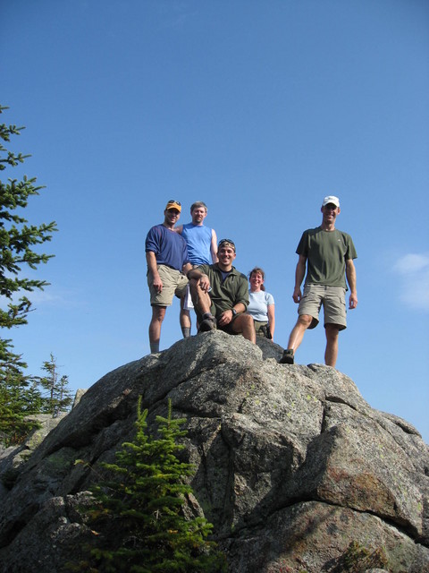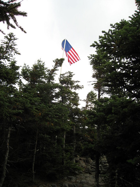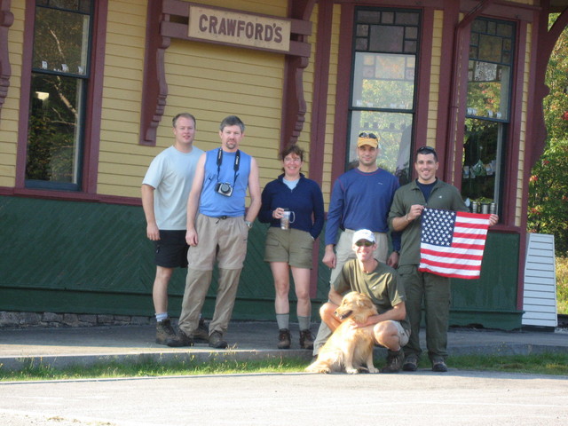 Avalon Trail to the Willey Range Trail to the Ethan Pond trail to the Kendron Flume trailby ChrisFinally, after a blazing hot and miserable summer, September had arrived and it was time for the Flags on the 48. I had spent a good amount of time planning the trip, and I had a committed group signed up to hike with me. My companions consisted of Dome, Paul, and Steve (who actually watched the Twin Towers fall and lived to tell about it). This year, everyone was up for a great hike, and when the day came, we all had a palpable level of excitement. We arrived at the Crawford Depot at about 7:45 AM (which for me was a miracle in itself!). Our plan was to hike the Avalon trail up to Mt. Field, stopping to admire the promised views from Mt. Avalon, then take the Willey Range Trail to Willey. After flying the flag from noon to 2:00 PM we would continue South on the Willey Range trail, meet up with the Ethan Pond trail and complete our hike down the Kendron Flume trail. This route provides an excellent variety of scenery and environment, but requires a car spot, so we asked Steve to park his car at the Willey House, which is conveniently located at the end of (or the beginning of) the Kendron Flume trail. When Dome, Paul and I arrived at the Crawford Depot, Steve (with the help of Tom and Laurie, who were covering Mt. Tom) were already there and enjoying their trip preparations. The temperature was still cool from the night before, but the sun was warming things up nicely, so we got our pre-hike picture taken, and we moved as one motivated group onto the trail, which is directly behind the Crawford Depot. I had traveled this same route earlier in the year, while there was still snow on the ground, so I was very curious to see how the trail would be different in warm weather. The Avalon trail begins the way every trail should (but doesn't); nice and gradual. We were all able to warm up on the slight incline and conversation was not a problem. Footing is excellent and the grade increases only slightly over the next mile or so. The Beecher and Pearl Cascades appear fairly quickly on the left (South) side of the trail, and despite the fact that we did not stop (we had a schedule to keep) are very much worth the extra few minutes. In fact these would be a great short hike for a family or group of "non-hikers". Before long, we reached the junction of the A-Z Trail. We met a few hikers here, none of which, to our surprise, asked about the 5 foot long poles sticking out of our packs. I guess people are use to anything. We continued on the Avalon trail and about another 10 minutes later the trail began to climb in earnest. Steve was a little unsure of the steep sections, since he hadn't hiked a 4,000 footer before, but he took it in great stride and kept moving without so much as a single complaint. The trail continues at an extraordinary steep pitch until it reaches the Mt. Avalon spur at almost 2 miles. We checked the time to make sure we had enough room in our schedule to bag Mt. Avalon, and to our surprise, it was only 10:00. We had pretty much matched book time, despite a few rest breaks along the way and lots of conversation, so we dropped packs and worked our way up to the summit of Mt. Avalon, which was small but spectacular! We had a very clear view to the East and South and could clearly see the Highland Center and Crawford Depot. With Tom's 300mm lens, we could even see our cars in the parking lot! Before too long, we packed up and hit the Avalon trail towards Mt. Field. Our hope was to make it to Willey by 11:30 and a long delay would jeopardize that schedule. From Avalon, the trail maintains excellent footing but returns to its previous, moderate grade. There is a nice saddle between Avalon and the base of Field that holds some beautiful flora and should not be ignored. We stopped briefly to check out the trail ahead but moved on after snapping a picture or two. At the base of Field, the grade increases slightly and signals the beginning of the end for anyone planning to end their trip on Field. We moved briskly up the side of Field, which was about another 1,000 vertical feet, with surprising energy. It's amazing what the promise of the next summit will do for some tired legs! At about 11:00 AM we arrived at the summit of Mt. Field and celebrated Steve's first 4,000 footer! Field's summit is not above tree line, so there are only a few places to catch some scenery. The weather had begun to deteriorate at this point, which made our views even more limited. We could clearly see Mt. Avalon and beyond down to the Highland Center. The best views are to the East and several other peaks are visible including Pierce, Jackson and Webster. After a short rest at Field, we felt that we should move on and get our flag flying. We began the moderate descent into the saddle between Field and Willey. Between the two peaks, the flora has that familiar but unique quality of splintered sunshine, moss, evergreen and wood bark. I find that this environment can't be found in any other place except at this elevation and is one of the rewards of hiking to 4,000 feet. The Willey Range trail continues its descent and wraps around the western side of the ridge before beginning the moderate ascent to Mt. Willey. At almost exactly 11:30 we arrived at the summit of Mt. Willey and began to set up our tribute. Willey is another tree-lined summit, which was ok with us because it gave us many options for anchoring our flag pole. We all worked together to find a solution to securing the flag and before we knew it, Old Glory was poised a good five feet above the trees and hopefully visible from some of the other peaks in the range. We took some pictures and moved on down the trail to the outlook, which afforded spectacular views of Webster (includng the Webster Cliffs) and Jackson, and in clear weather Pierce, Eisenhower, Washington, Monroe, Jefferson and even Isolation. We sat down to enjoy the scenery, snap some pictures and 