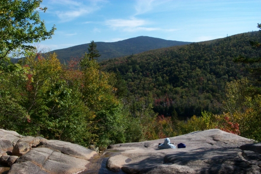 | Here you can see a hut visitor reading at the top of the Zealand Falls. Not a bad way to spend some time. |